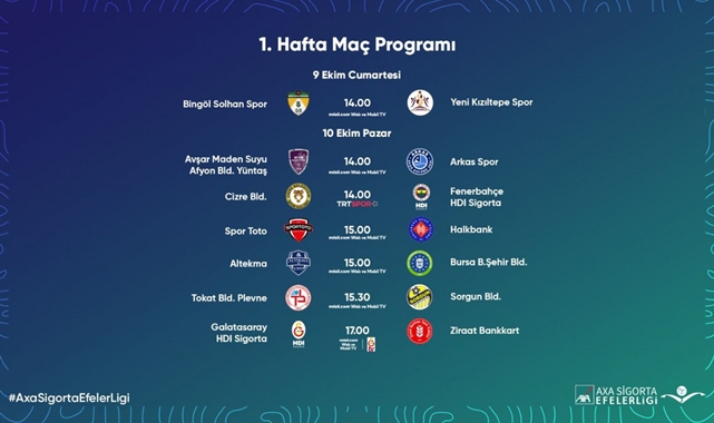 AXA Sigorta Efeler Ligi’nde 2021-2022 sezonu, 9 Ekim Cumartesi günü oynanacak Bingöl Solhan Spor – Yeni Kızıltepe Spor karşılaşmasıyla başlayacak.İlk haftanın maç programı şu şekilde: