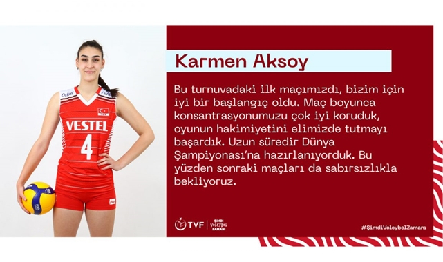20 Yaş Altı Kız Milli Takımımız, FIVB U20 Dünya Voleybol Şampiyonası’ndaki ilk rakibi Tayland’ı 3-0 yenerek şampiyonaya galibiyetle başladı. On üç sayıyla skora en çok katkı sağlayan isimlerden biri olan Karmen Aksoy, maçın ardından görüşlerini paylaştı:“Bu turnuvadaki ilk maçımızdı, bizim için iyi bir başlangıç oldu. Maç boyunca konsantrasyonumuzu çok iyi koruduk, oyunun hakimiyetini elimizde tutmayı başardık. Uzun süredir Dünya Şampiyonası’na hazırlanıyorduk. Bu yüzden sonraki maçları da sabırsızlıkla bekliyoruz.”